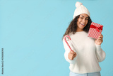 Beautiful young African-American woman with Christmas gift box and candy cane on blue background