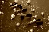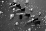Beautiful composition with lipsticks, glitter and Christmas balls on red background