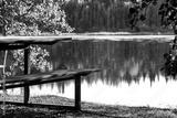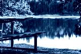Picnic wooden table at the lake in the forest in summer.