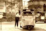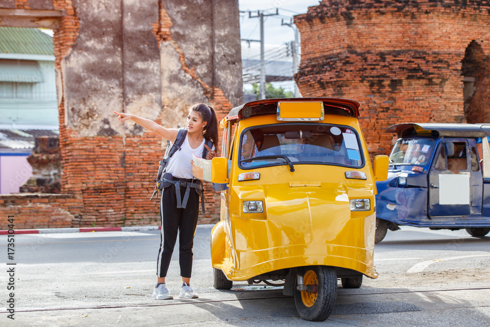 Traveler japanese girl hollding map travel query for the way with old man driver taxi or tuk tuk touring, Ayutthaya Province, Thailand