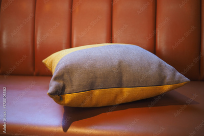 Cozy pillow resting on a warm brown couch in a lounge