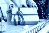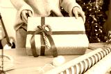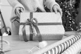Beautiful young woman with candy cane and wrapped Christmas gift box on table at home