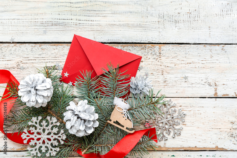 Christmas composition with fir tree branches, silver cones, Christmas decor and red envelope on white wooden background. Top view