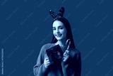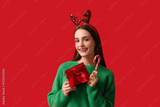 Young woman in reindeer horns with Christmas gift and candy cane on red background