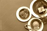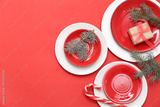 Beautiful Christmas table setting with gift box, fir branches and candy cane on red background