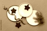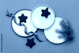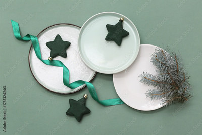 Beautiful Christmas table setting with stars, fir branch and ribbon on green background