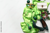 Composition with stylish clothes, accessories and Christmas decorations on white background