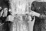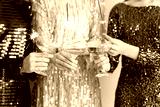 Women in elegant dresses with glasses of champagne and burning Christmas sparklers on color background, closeup