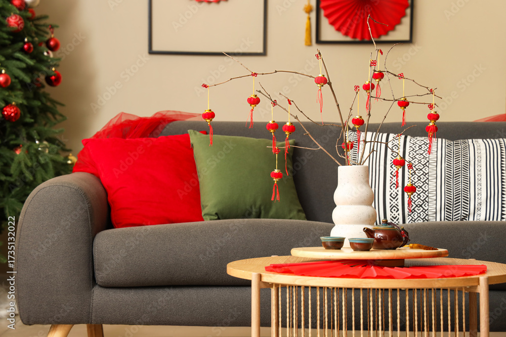 Vase with tree branches, Japanese symbols and tea set on table in living room decorated for New Year celebration