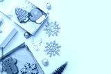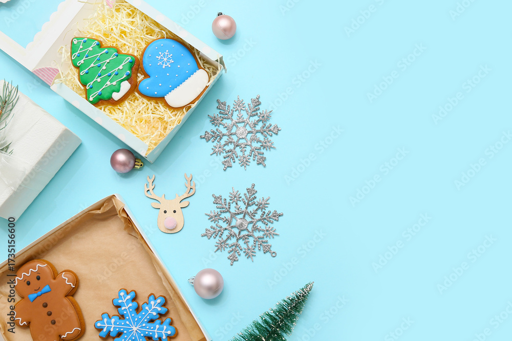 Gift boxes with sweet gingerbread cookies and Christmas decorations on blue background
