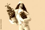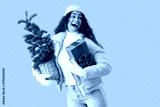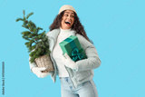 Pretty young African-American woman in warm winter clothes with Christmas tree and gift box on blue background