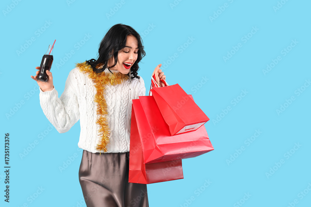 Pretty young woman with shopping bags and cola on blue background. Christmas sale concept