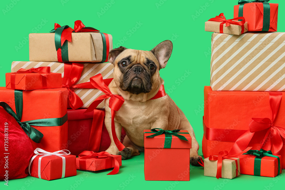 Cute French bulldog with bow and gift boxes on green background. Christmas celebration