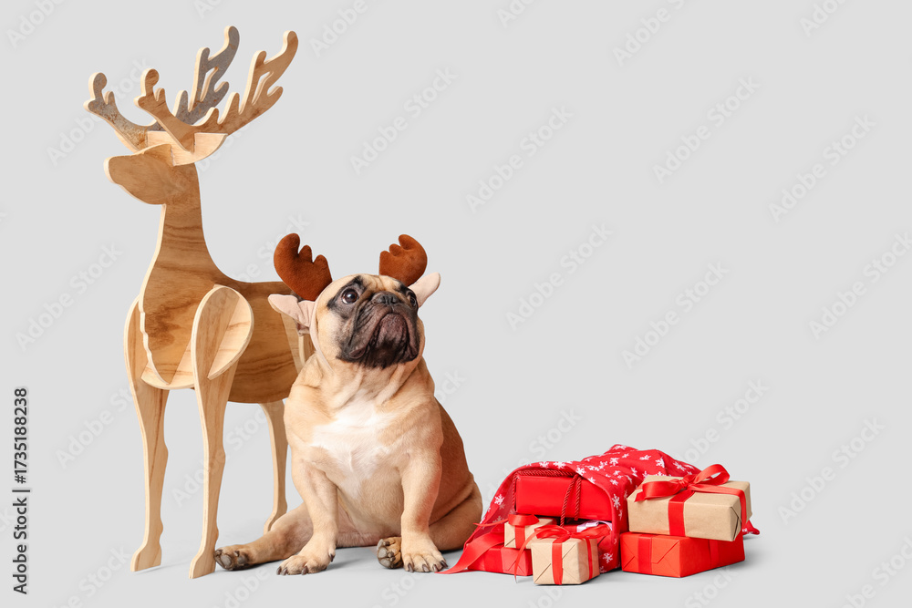 Cute French bulldog in reindeer horns with gift boxes and wooden deer on grey background. Christmas celebration