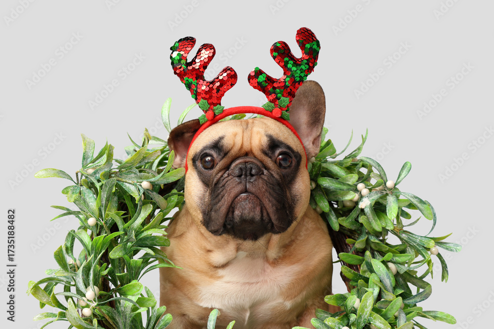 Cute French bulldog in reindeer horns with Christmas wreath on grey background