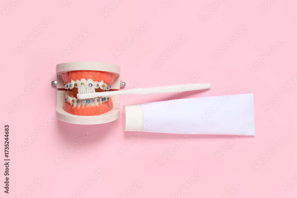 Model of jaw with dental braces, toothbrush and toothpaste on pink background