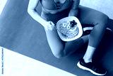 Mature sporty woman with bowl of nutritious oatmeal, fruits and avocado sitting on yoga mat, top view