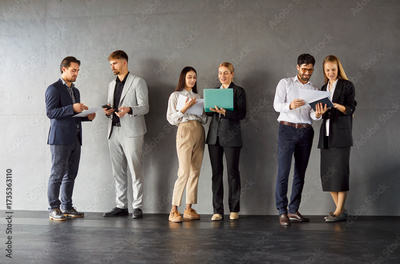Full length photo of a group of confident business people men and women chatting after meeting on dark gray background. Company employees in modern office or conference room discussing work project.