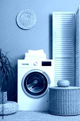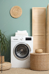 Washing machine, folding screen, houseplant and laundry basket near green wall in interior of bathroom