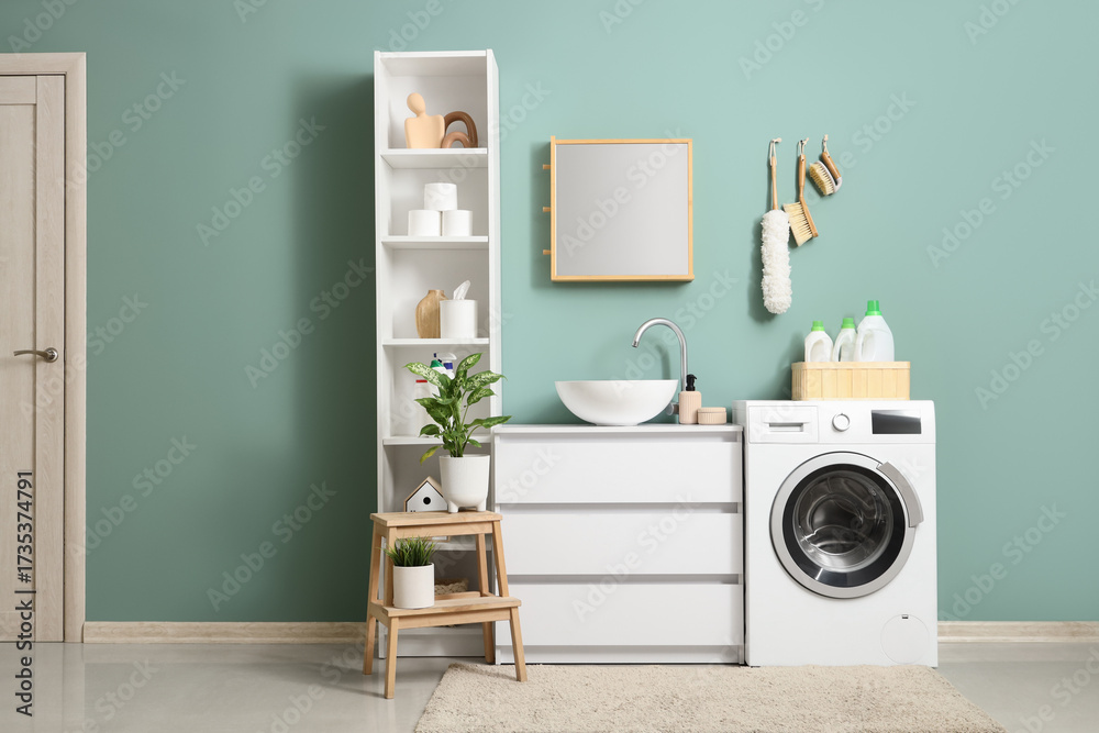Modern washing machine, shelving unit and chest of drawers with sink in interior of bathroom