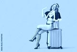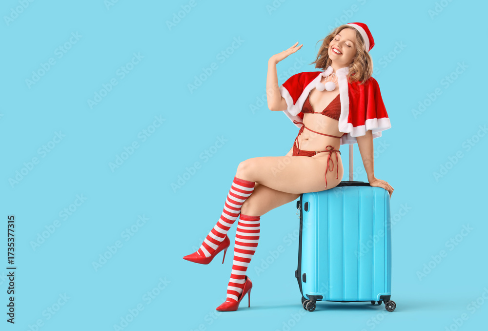 Attractive young woman in swimsuit with Santa hat and suitcase on blue background. Christmas celebration