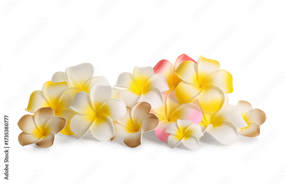Beautiful many colorful plumeria flowers isolated on white background