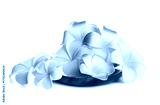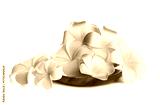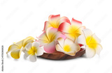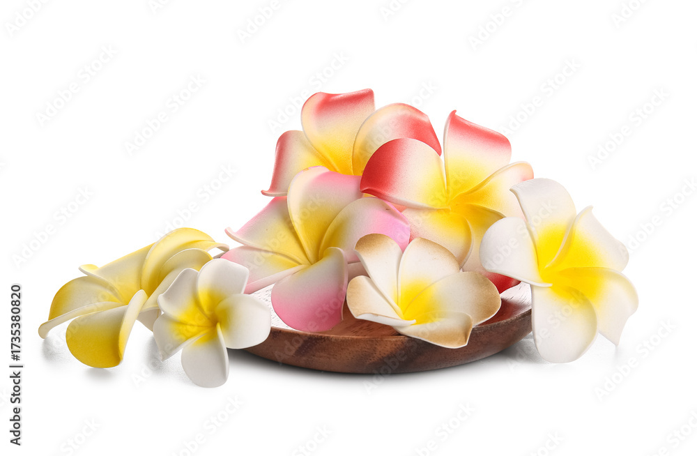 Wooden plate with beautiful colorful plumeria flowers isolated on white background
