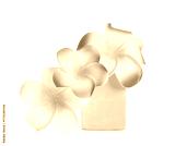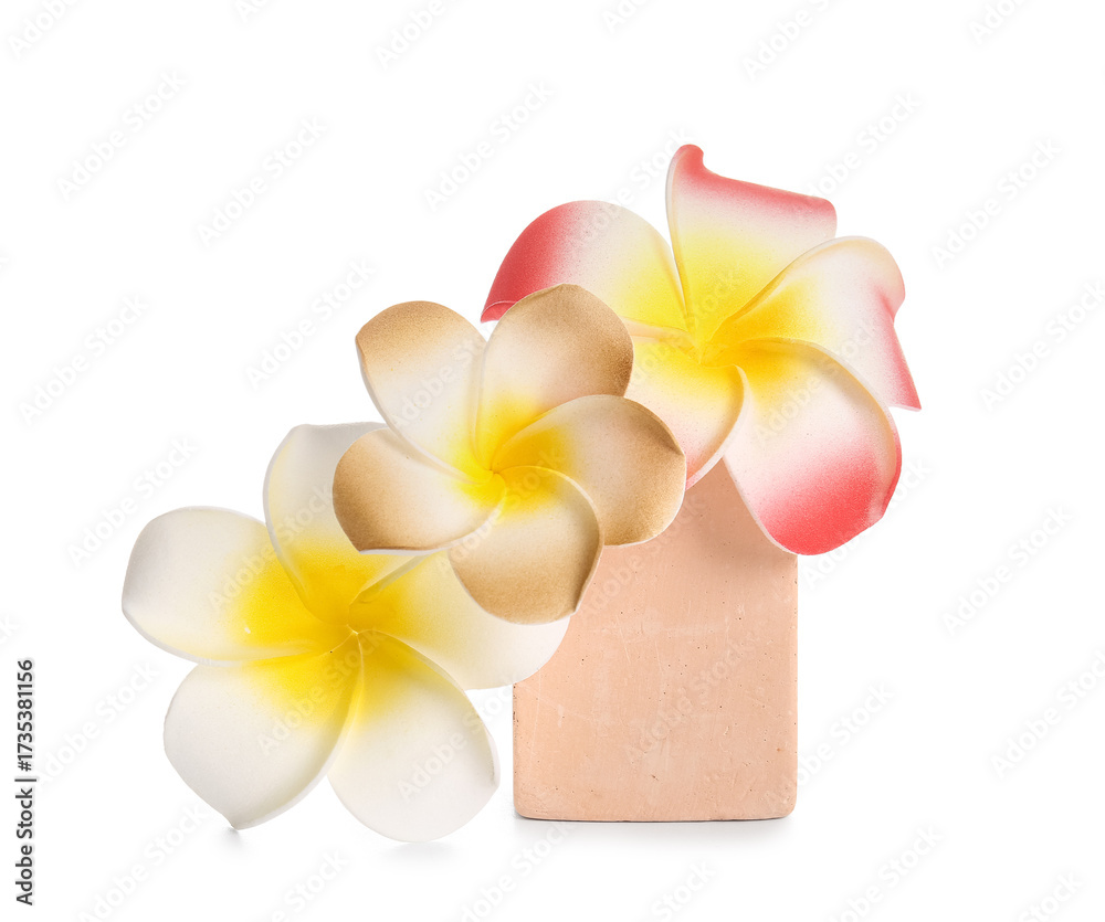 Decorative podiums with beautiful colorful plumeria flowers isolated on white background