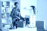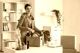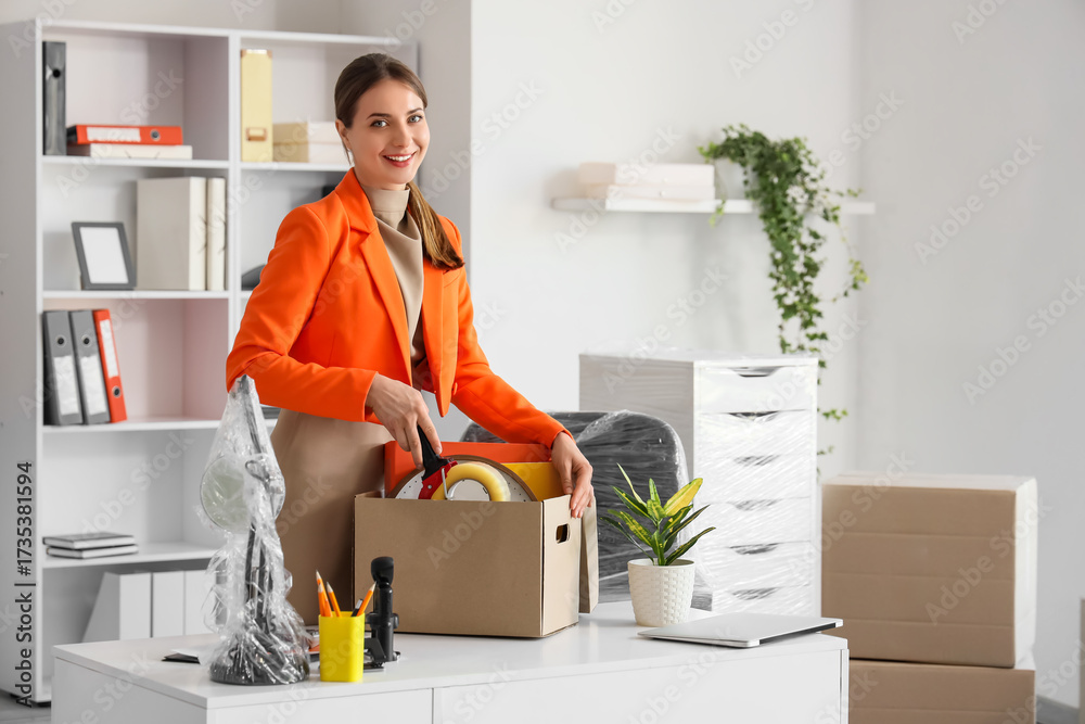 Young happy businesswoman packing tape dispenser into cardboard box of belongings in office on moving day