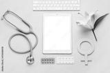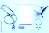 Tablet with stethoscope, symbol of woman, orchid flower, keyboard and pills on blue background