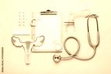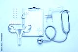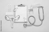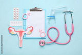 Clipboard with stethoscope, symbols of woman, gynecological speculum, paper uterus and pills on blue background