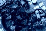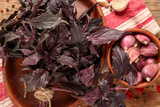 Plate with fresh purple basil leaves and bowl of garlic on wooden background