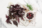 Cutting board with fresh purple basil leaves, rosemary and peppercorns on white background