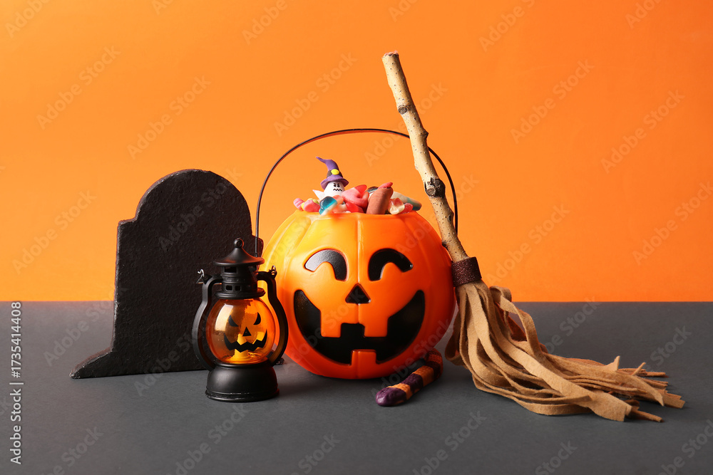 Cauldron in shape of pumpkin with candies for Halloween, broom and lantern on orange background