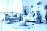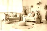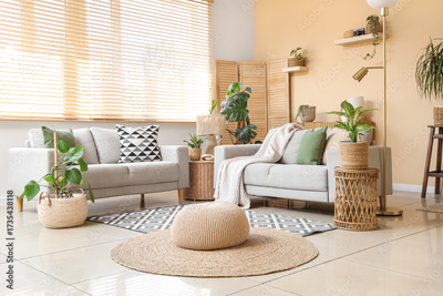 Interior of living room with sofas, wicker pouf and baskets with houseplants near window