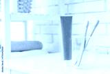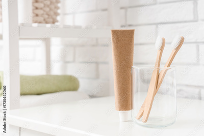 Toothpaste and glass cup with toothbrushes on table in bathroom, closeup