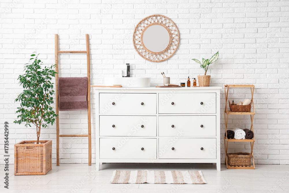 Interior of light bathroom with mirror, sink and toiletry on chest of drawers