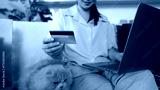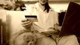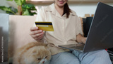 E-commerce. Woman making online purchase with credit card and cat by her side.