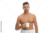 Morning drink after shower. Muscular mature man. Mature handsome man with muscular torso drinking coffee isolated on white. Morning routine. Morning coffee of handsome man with torso