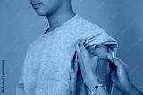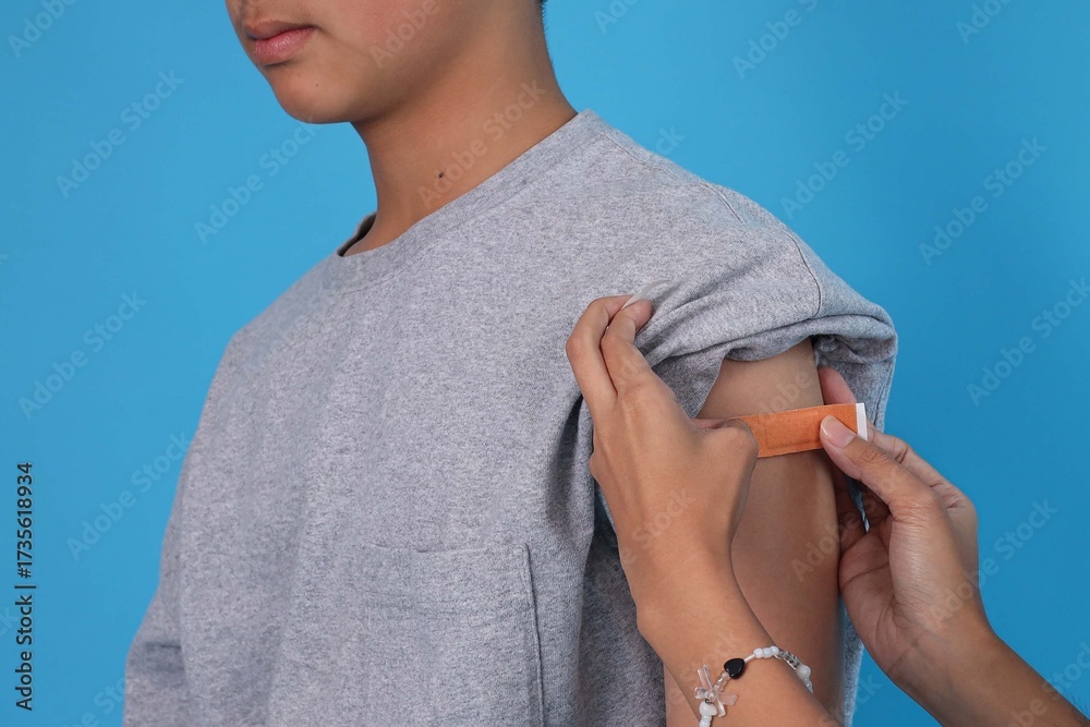 Hands Applying a Bandage to Children Boy After Vaccination Isolated on Blue Background