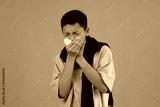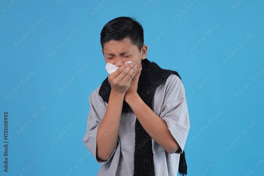 Teen Boy with Cold Sneezes into Tissue, Feeling of Being Sick and Influenza Isolated on Blue Studio