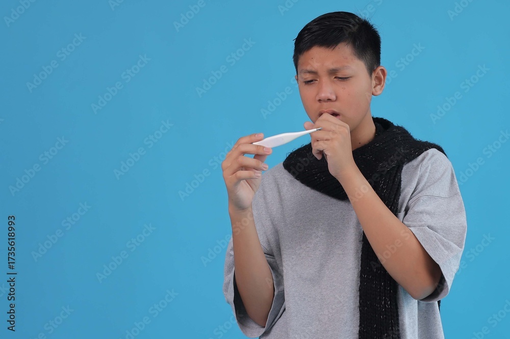 Asian Boy Feeling Unwell, Checks Temperature with Digital Thermometer Isolated on Blue Background