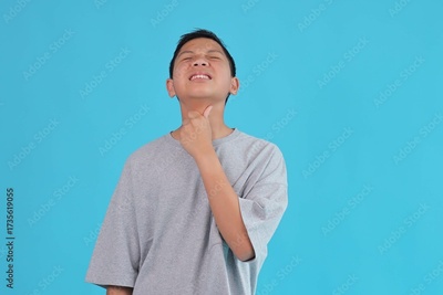 Portrait of Young Asian Boy Touching Neck Feeling Pain In Throat Isolated On Blue Background