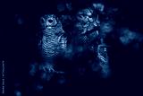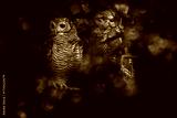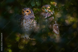 Spotted wood owl, Strix seloputo, mother and young in the gren vegetation, Malaysia in Asia. Spotted wood owl, Strix seloputo, pair in the nature habitat, forest bird on the tree, wildlife.