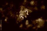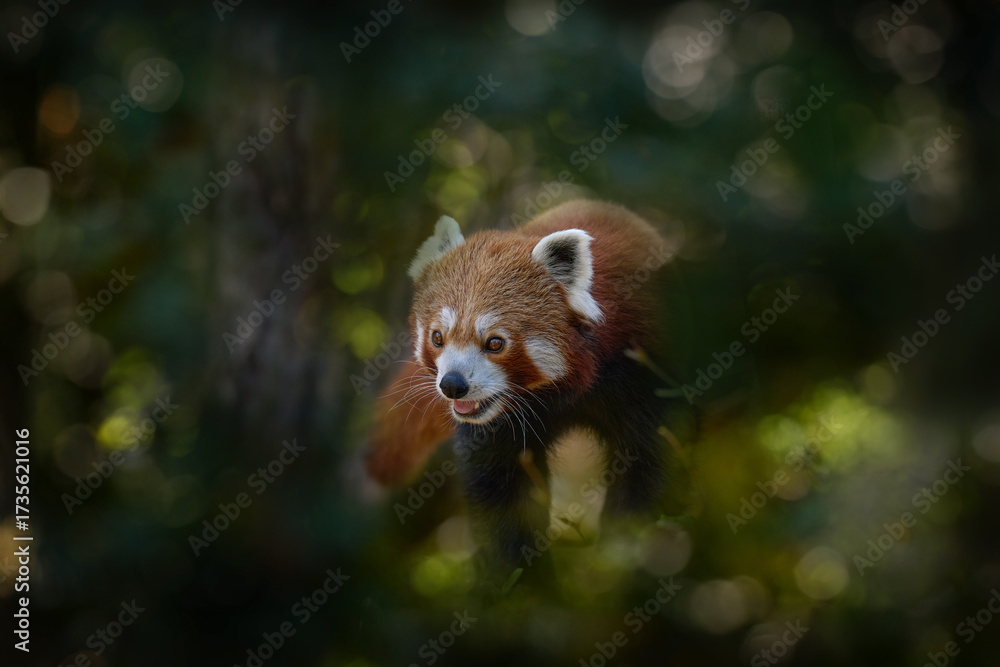 Ailurus fulgens, red panda, detail face portrait of animal from Nepal mountain forest. Wildlife nature. Red panda feeding tree fruit in Nepal. Panda lying on the tree with green leaves.