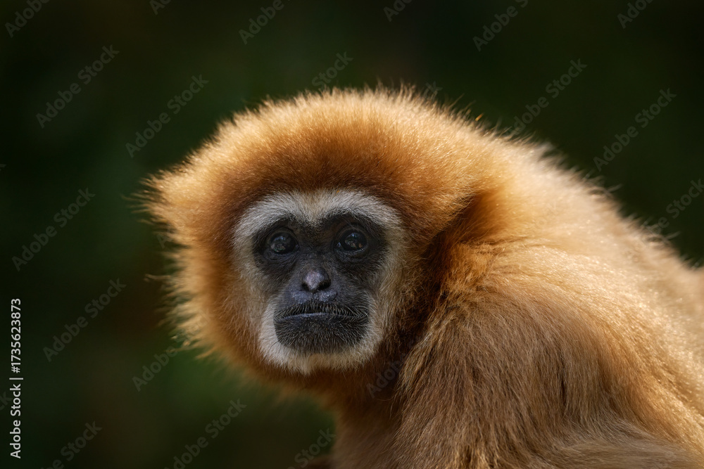 Lar gibbon, Hylobates lar, close-up portrait in the nature habitat. Golden monkey with black and white face in the nature habitat. Lar gibbon, forest tree in Khao Yai NP, in Thailand.