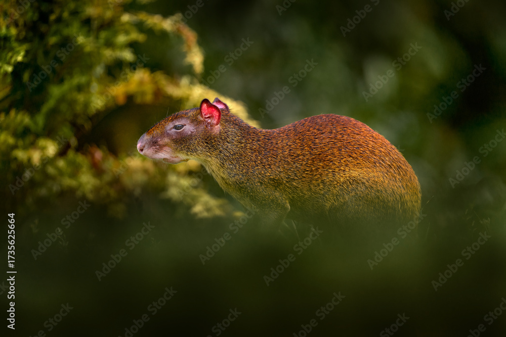 Agouti in nature. Wildlife Costa Rica. Agouti in the tropical forest. Animal in nature habitat, green jungle. Big wild mouse in green vegetation. Animal from Costa Rica. Mammal in the forest, wildlif