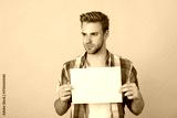 Man with copy space advertisement. Guy advertising. Announcement. Shopping sale and discount. Presenting product. Man with paper banner. Promotion and presenting. Man announcer promote idea