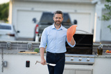 Cooking fish in backyard. Middle aged Hispanic man grill salmon barbecue. Barbecue and grill. Smoked salmon. Roasting and grilling food. Chef man do BBQ fish. Man cook salmon in the kitchen