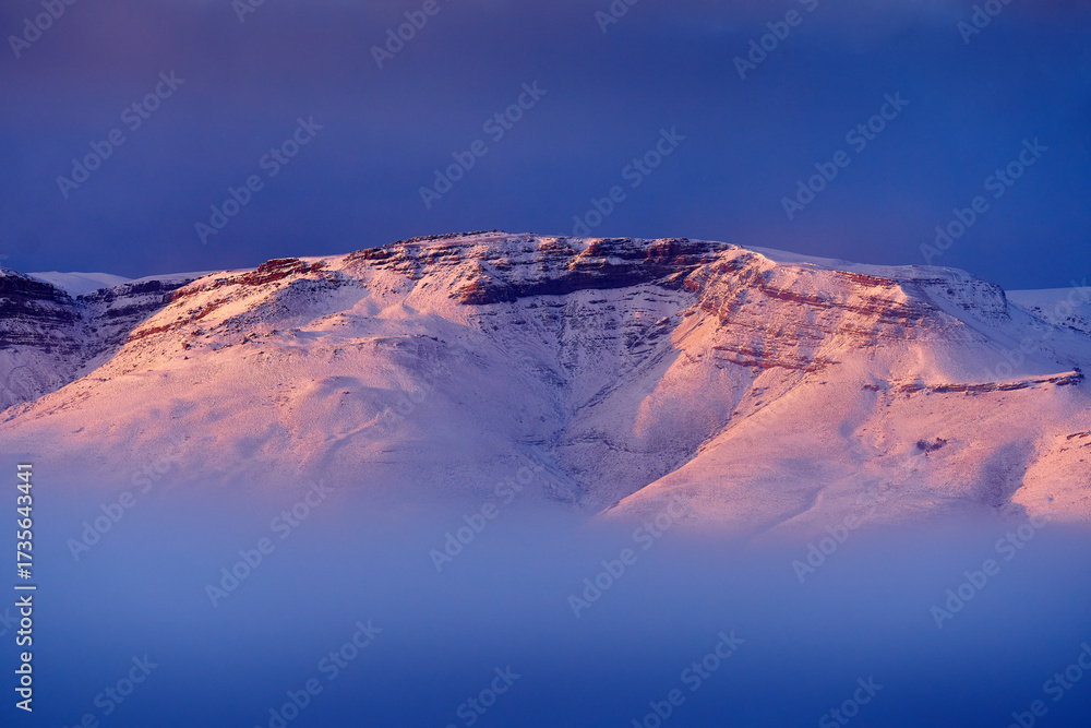Winter twilight lanscape from Patagonia moutains with snow. Lago Nordenskjold, Torres del Paine National Park, Chile. Pink blue evening sky. Traveling in Chile, hills in Torres del Paine NP.